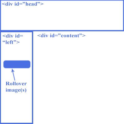 I basically made a background in Adobe Photoshop and have pieced it into two pieces. The top half of the image is inside the container dubbed "head," while the menu side of the webpage is inside the container dubbed "left." Now, comes the tricky part. I have made buttons that i wish to have a rollOver effect that are inside the container "left."